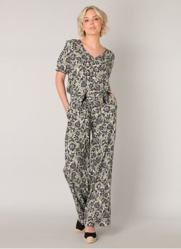 Blousje van Yest Fashion met een all-over bloemenprint in groen-zwart. Deze blouse van 100% viscose heeft korte mouwen met elastiek in de manchetten. De halslijn is rond en heeft een split met een koordje. Lengte 66cm. Materiaal: 100% viscose