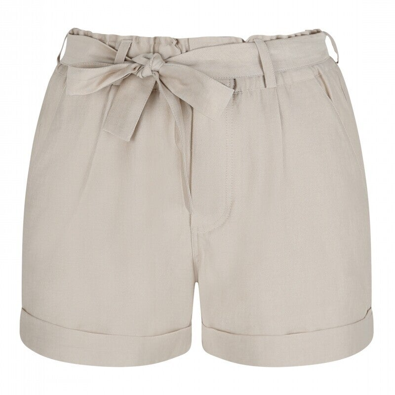Deze short heeft een mooie zandkleur, een strik ceintuur en een korte pijp met omslag. De korte broek is gemaakt van 90% lyocell en 10% polyester.