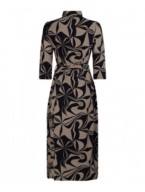De Travel doorknoopjurk Charly van Zoso neemt je mee in een dans van taupe en zwarte tinten. Dit subtiele kleurenspel geeft de jurk een chique en tegelijkertijd moderne uitstraling die zich moeiteloos aanpast aan elke gelegenheid. De jurk heeft een kraagje, driekwart mouwen en een stoffen ceintuur.