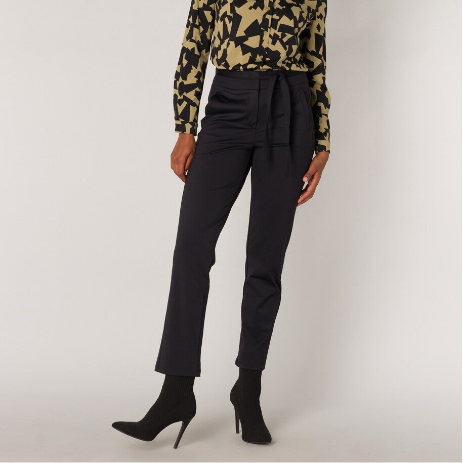 Yest regular fitted pantalon 'Paula' van travelstof. Deze broek heeft een fijne hoge tailleband, sluit met een rits en een stoffen ceintuur die geknoopt kan worden in de taille. Voorzien van steekzakken en paspelzakjes op het achterpand. Materiaal: 75% polyamide/25% elasthan