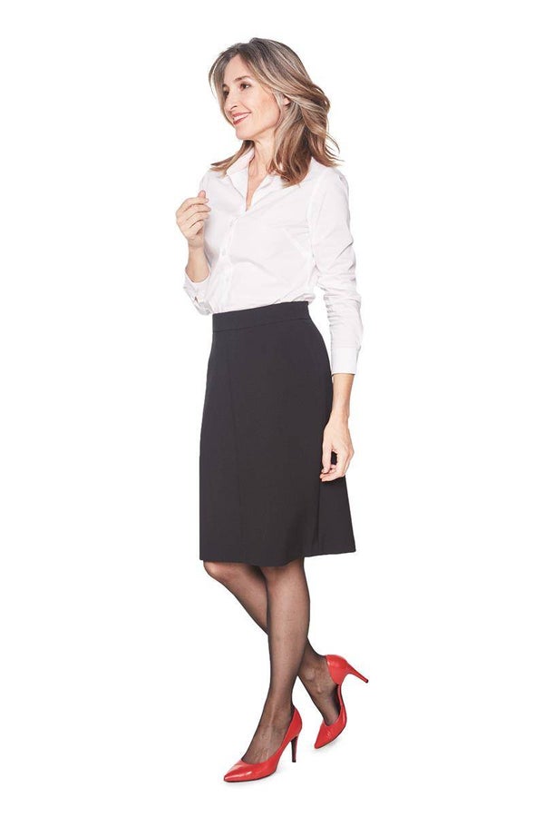 Prachtig basic rokje in een zwarte crêpestof. Dit basic rokje is gevoerd (winterkwaliteit) en bijzonder geschikt voor een zakelijke outfit. Voor, achter en aan de zijkant een mooie lengtenaad. Sluit onzichtbaar met een kort ritsje in de achternaad. Een voordeel van crêpe: het valt altijd prachtig soepel om je lichaam en de stof kreukt bijna niet. Materiaal polyester/ elasthan.