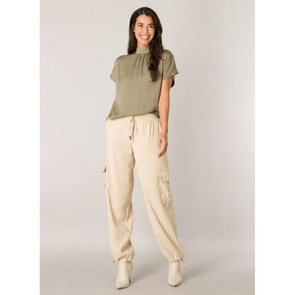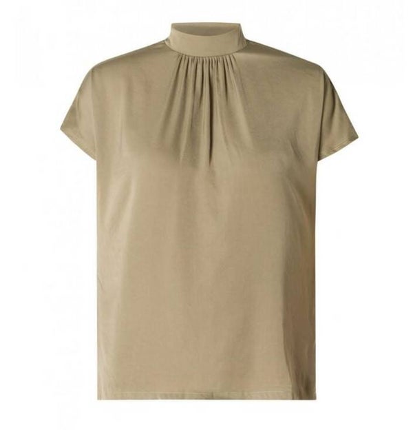 Zacht glanzende top met aangeknipte mouw. Recht model met opstaand boordje en ritssluiting aan de achterkant. 100% gerecycled polyester. Ruglengte 67 cm in maat 38.