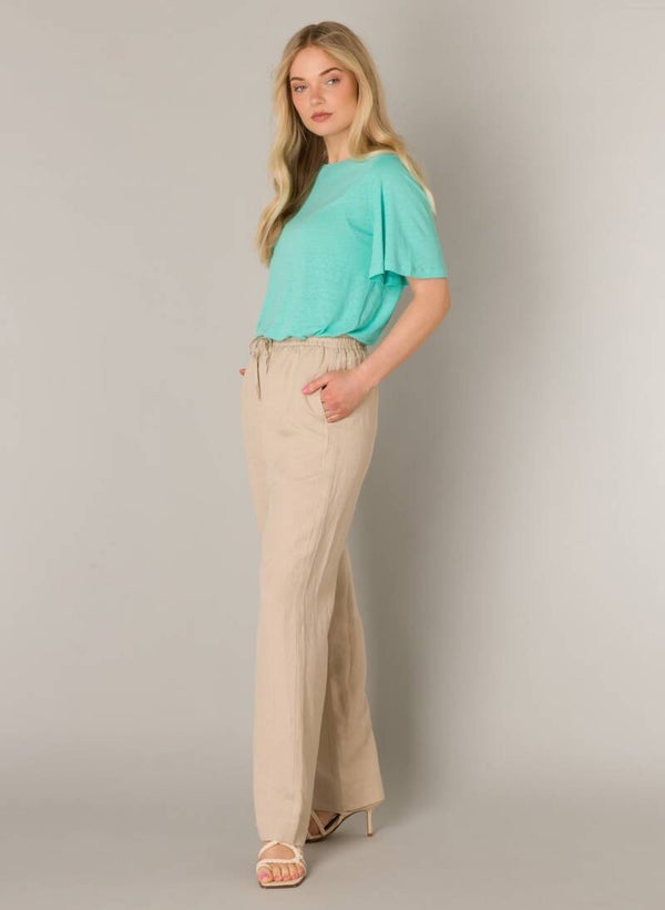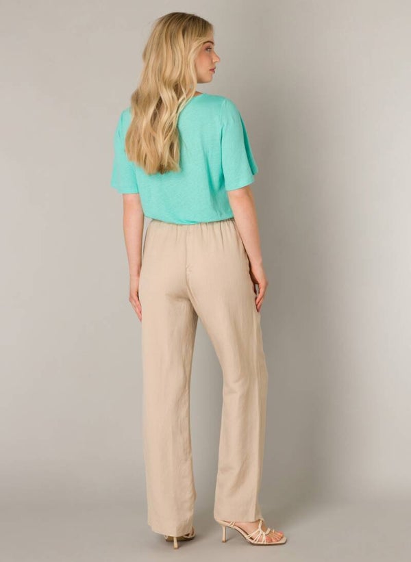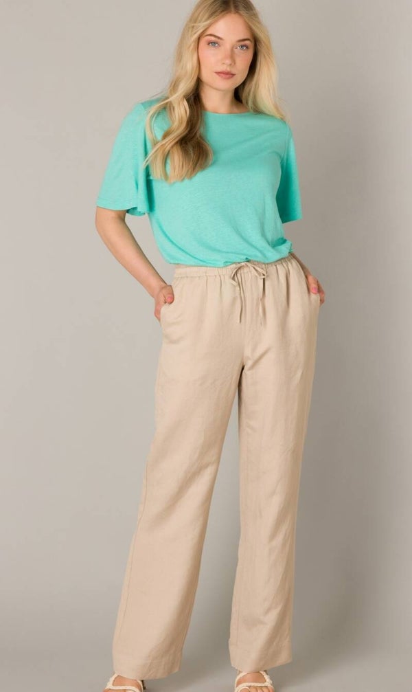 Wijdvallende linnen broek van YEST met elastische tailleband en fijne steekzakken. Deze lekkere zomerse broek is een echte Musthave. Verkrijgbaar in zandkleur.