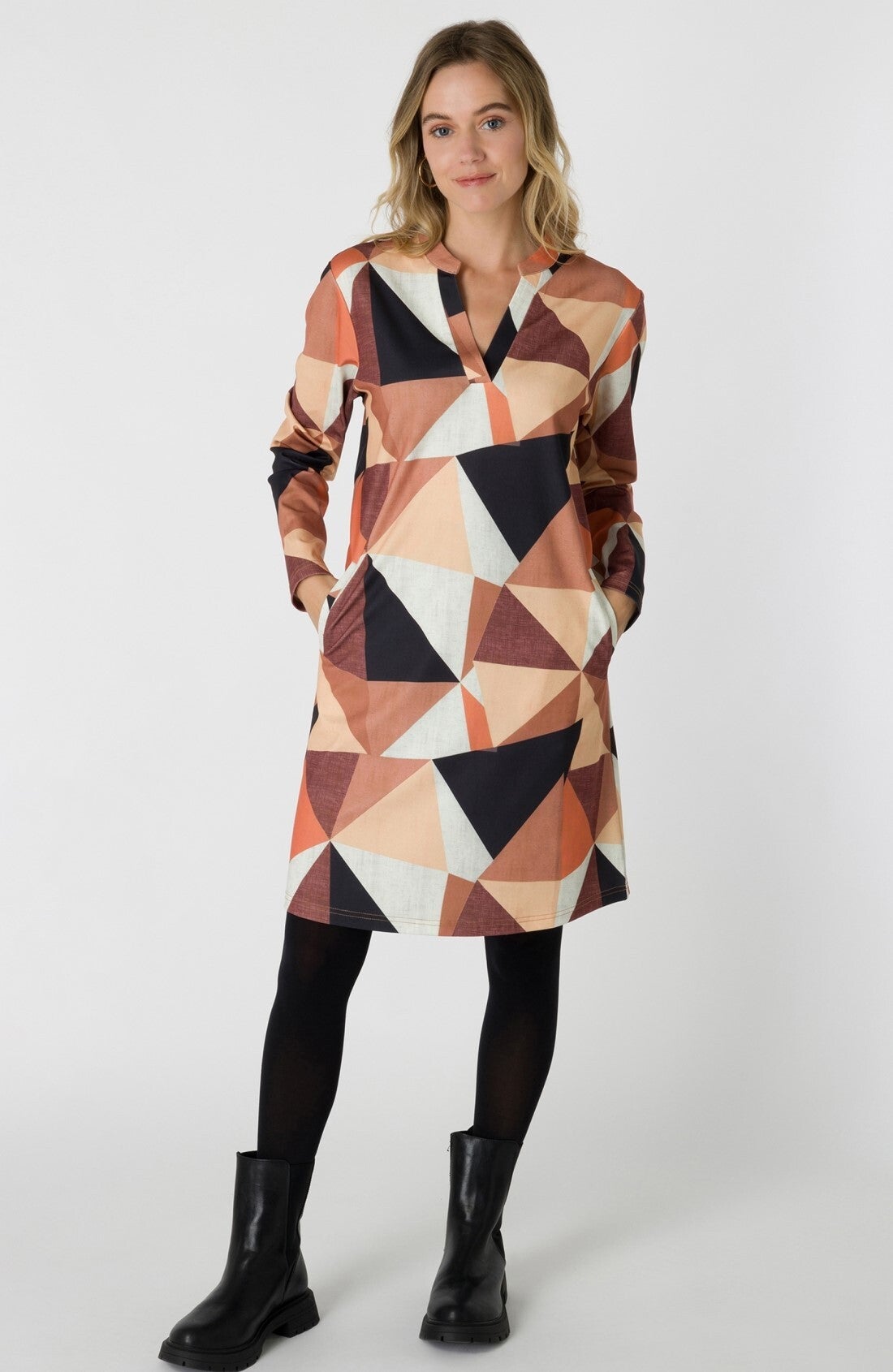 Tuniek / Jurkje van ES&SY in mooie warme kleurcombinatie van bruin, oranje,zwart en nougat. Dit tuniek heeft een gladde stuctuur, valt soepel en draagt bijzonder comfortabel. 'Brenda' valt mooi soepel, heeft lange mouwen en zakjes in het voorpand.