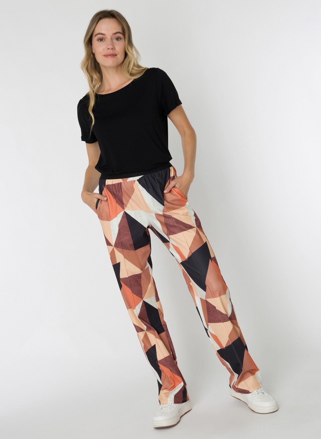 Deze jersey broek met een grafische retro print in bruin, oranje en zwart is een echte eyecatcher. Het rechte model en de elastische band zorgen voor een comfortabele pasvorm, terwijl de vintage uitstraling je look een speelse twist geeft.