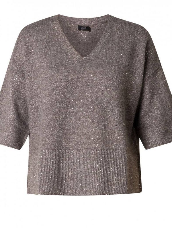 Wijde gebreide trui van Yest fashion met een V-hals en driekwart mouwen. In de stof zit een zilverkleurige lurexdraad verwerkt.