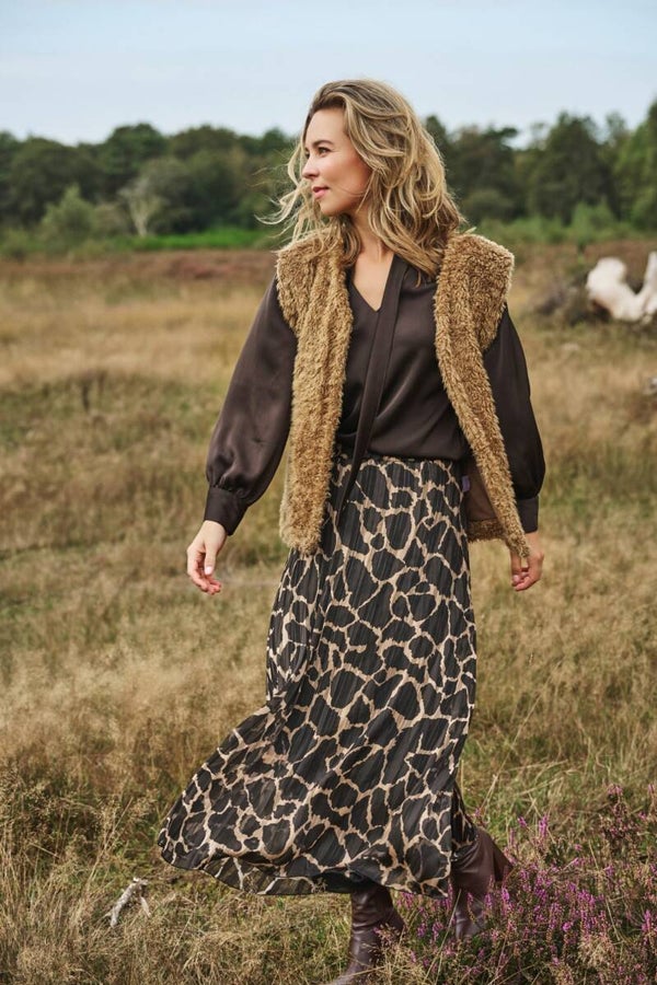Elvira Collections Rok Fenna is een lange rok gemaakt van transparante plissé in combinatie met een gladde voering. Deze Elvira rok heeft een elastische tailleband en een allover giraffe print met goudkleurig glitterdraad accent.