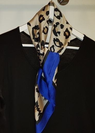 Satijnen sjaaltje in klein formaat met dierenprint in blauw, ecru en zwart voor om je hals, maar ook leuk aan je tas!