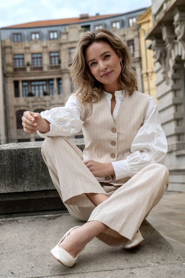 Het Gilet Jody Creme Pin Stripe van Elvira Collection is een tijdloos en elegant kledingstuk dat perfect is voor een stijlvolle, gelaagde look. Dit mouwloze gilet heeft een klassieke V-hals en een slanke pasvorm, waardoor het moeiteloos kan worden gecombineerd met een blouse, trui of top