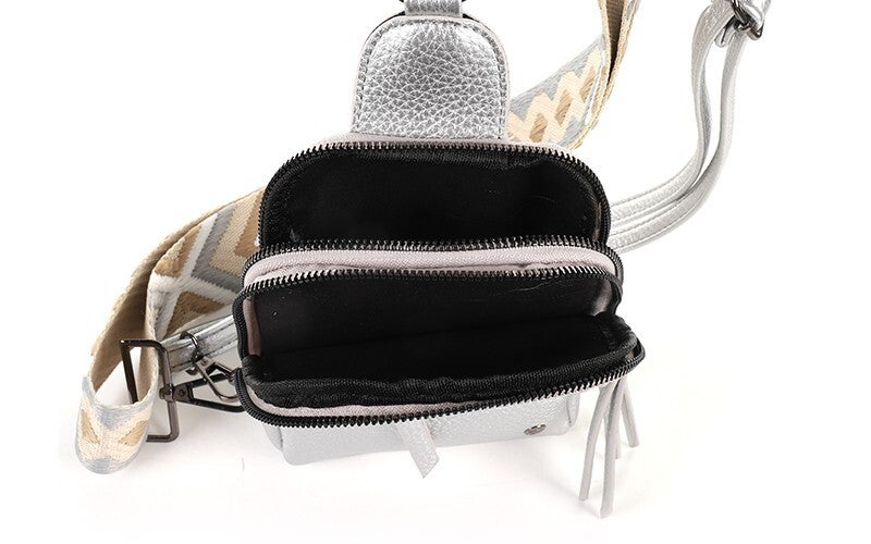 Het tasje bevat 2 vakken gesloten door een rits met genoeg ruimte voor iedere soort mobiele telefoon, maar daarnaast ook plek voor andere benodigdheden als sleutel, brillenkoker, geld en pasjes. Ook aan de voorkant van de tas zit nog een extra afsluitbaar vakje.