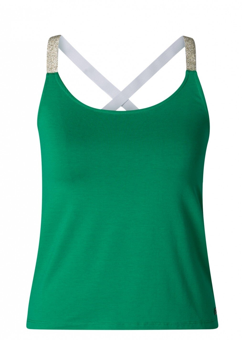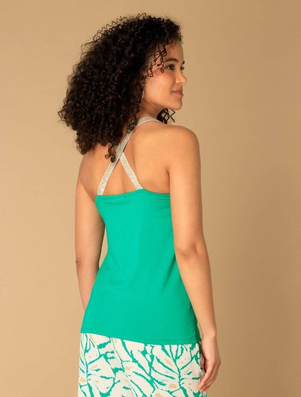 Het hemdje is gemaakt van een zachte viscosemix en heeft gekruiste bandjes met een subtiele glitterafwerking, wat het een extra vleugje stijl geeft. Perfect voor een casual zomeroutfit met een beetje sparkle. Verkrijgbaar in de kleuren Smaragd Green en Bright White.