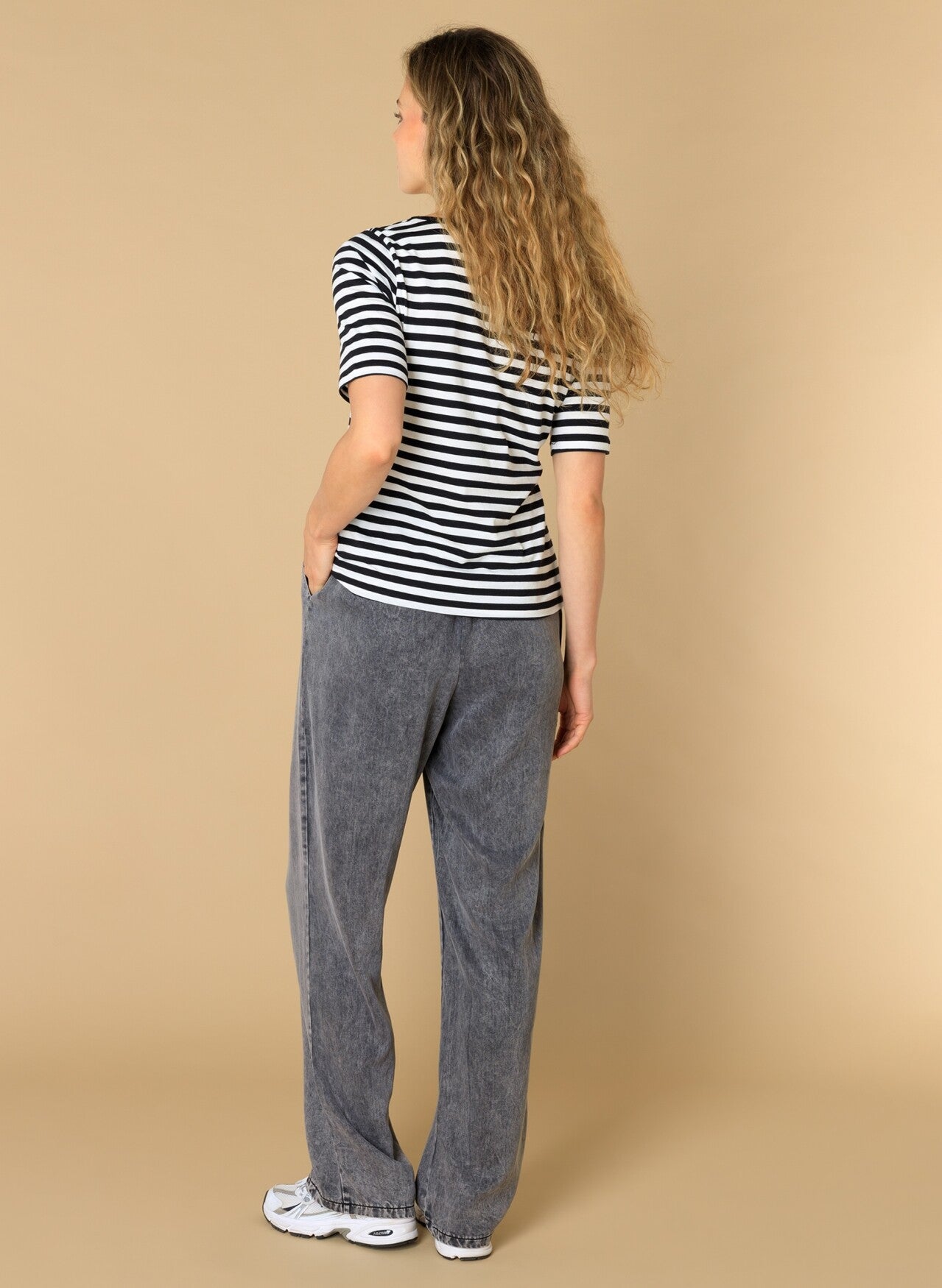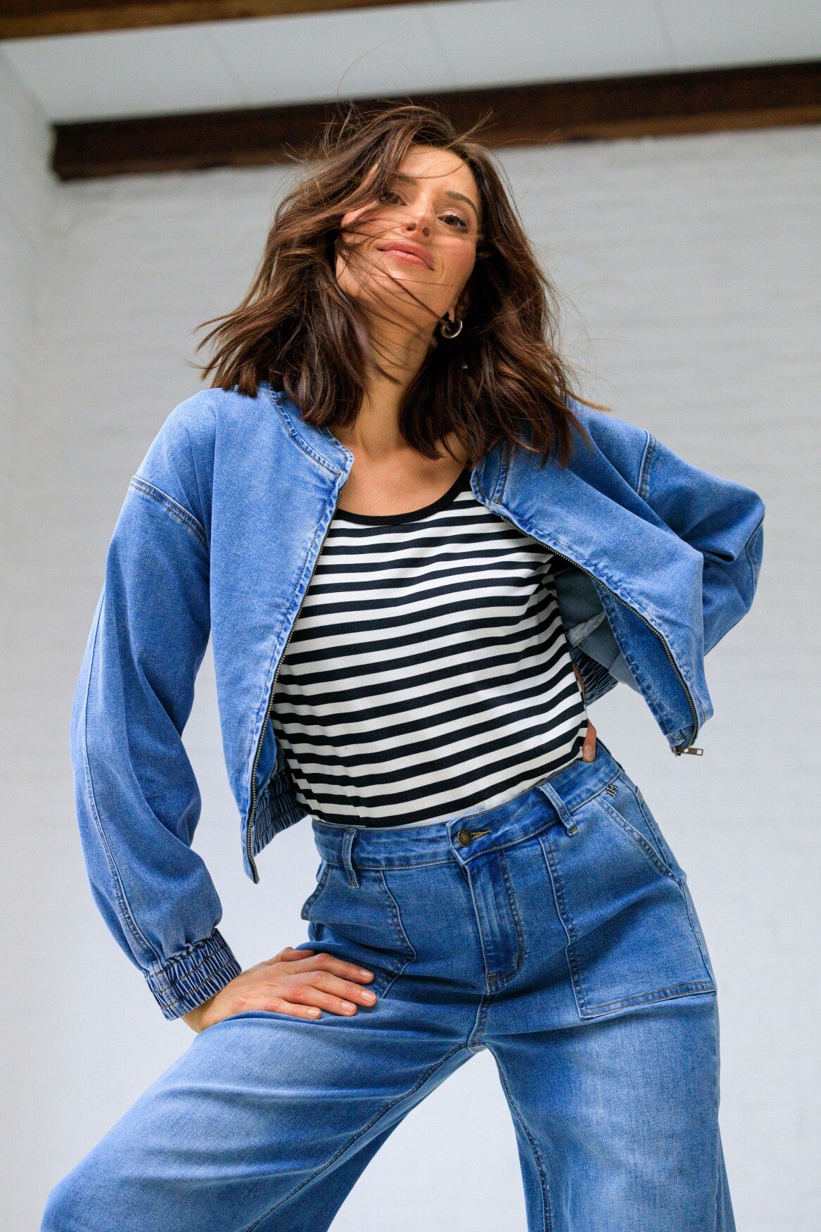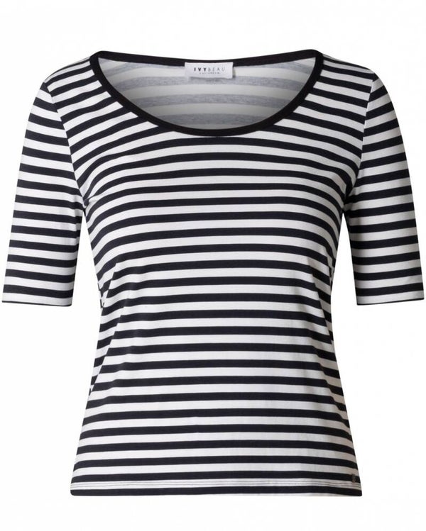 Esha bewijst dat een basic allesbehalve saai hoeft te zijn. De zwart-witte streep, zachte stretchjersey en vrouwelijke ronde hals zorgen voor een fijne fit met eindeloze combinatiemogelijkheden. Makkelijk, flatterend en met een vleugje Parijse nonchalance.