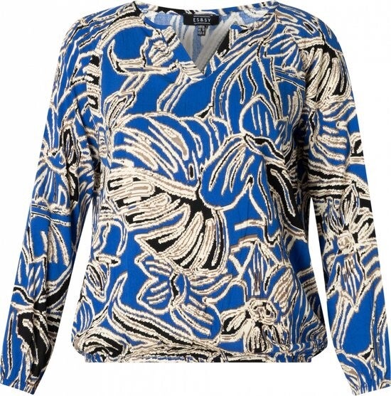 Elegante blouse met ronde halslijn en V-inkeping, afgewerkt met elastische mouwen en manchetten. Gemaakt van zachte viscose in een prachtige blauwe print. Een comfortabele en stijlvolle keuze voor elke gelegenheid.