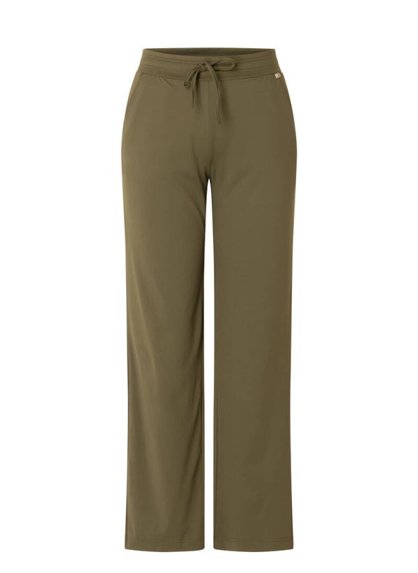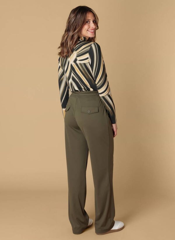 Zacht, luchtig en verrassend stijlvol. Deze olivekleurige broek van dunnere travelkwaliteit is ideaal als je comfort wilt met een nette uitstraling. Dankzij de rechte pijp en stretchy stof draag je haar als loungewear, maar combineer je ‘m ook moeiteloos chic.