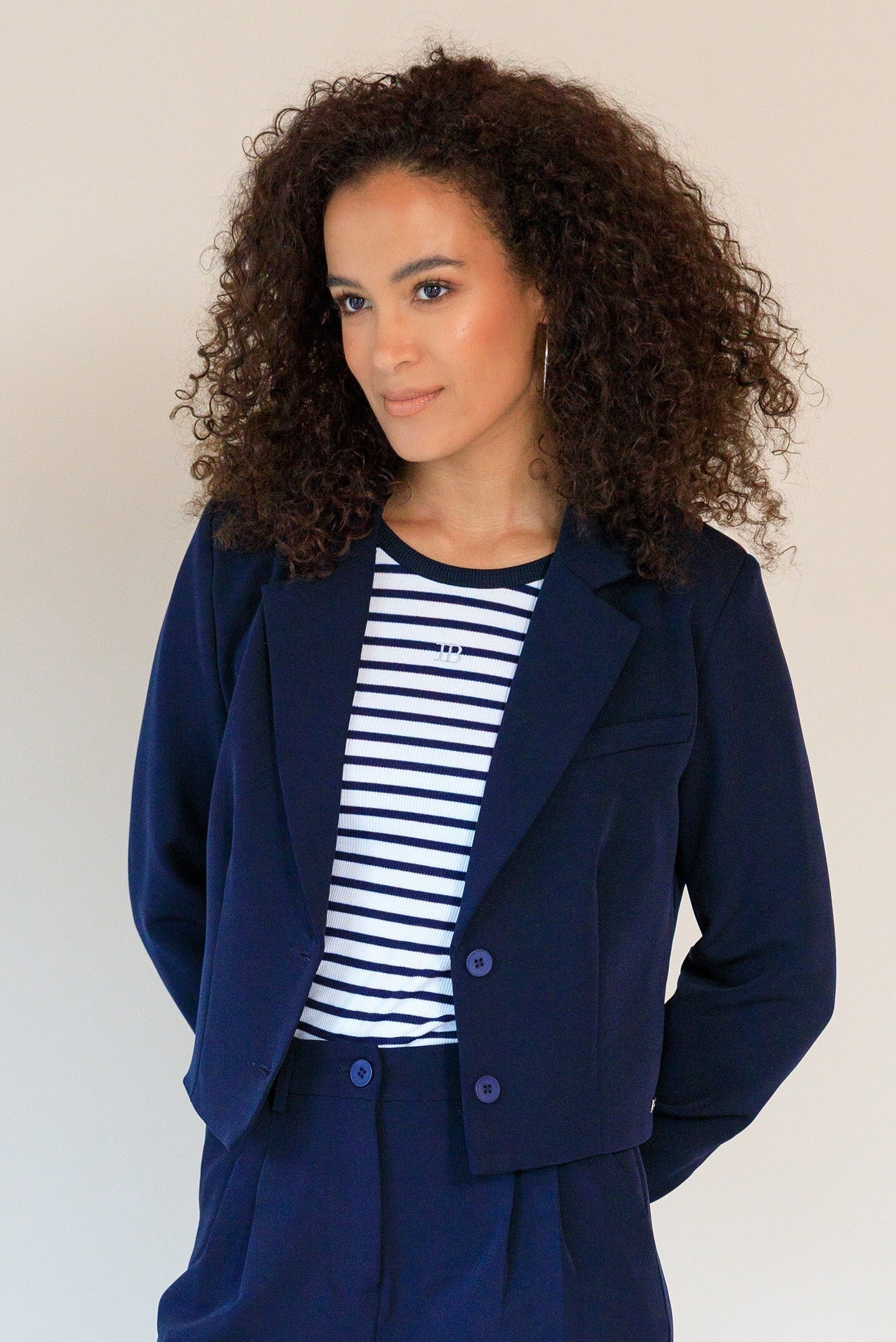Power dressing, maar dan luchtig! Dit korte jasje van Ivy Beau met boxy fit en elastische boord in de manchetten, geeft elke outfit een moderne twist. Draag hem samen met de matching pantalon voor een frisse, stijlvolle set in powder blue of dark navy – ready to impress!