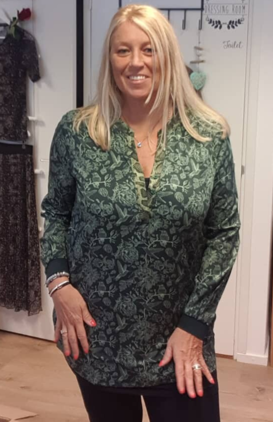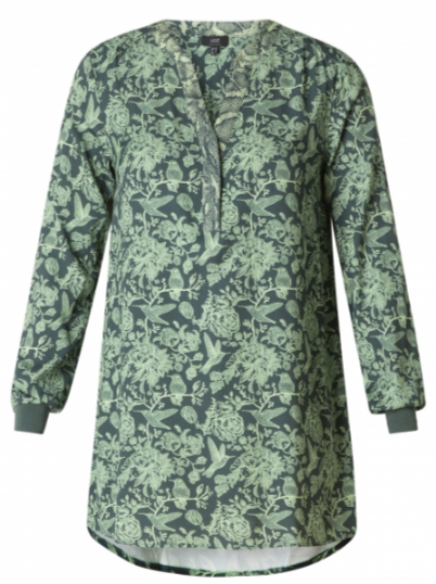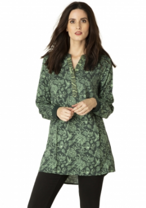 Tuniek met een gedessineerd bloemen/vogelpatroon. Dit model heeft donkergroene boorden aan de mouwen en een achterkant die langer valt.