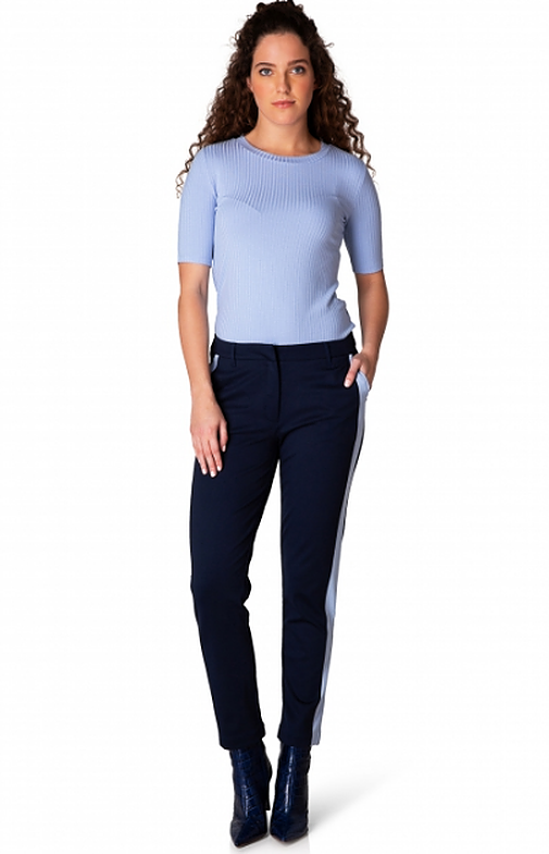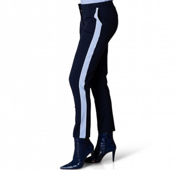 Pantalon van Yest Fashion in een stevige jersey stof. In de zijnaad steekzakken een brede bies in een lichtblauwe kleur. Lengte28 inch. Materiaal: 60% Viscose, 35% Polyester, 5% Elastan.