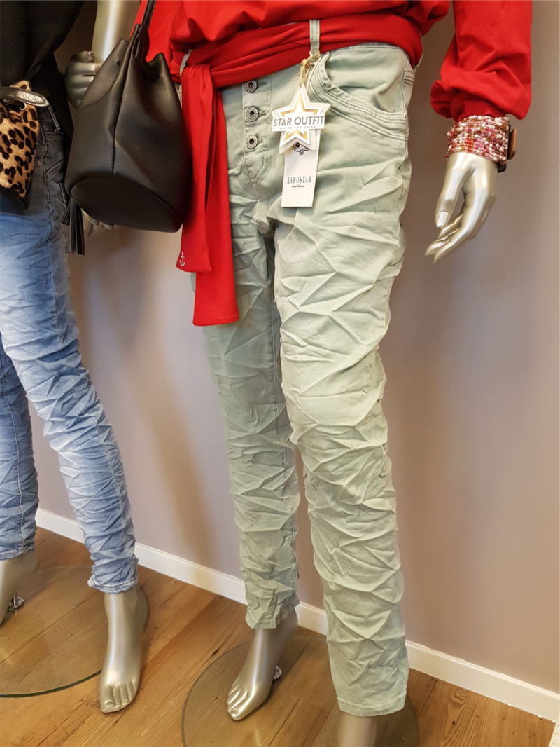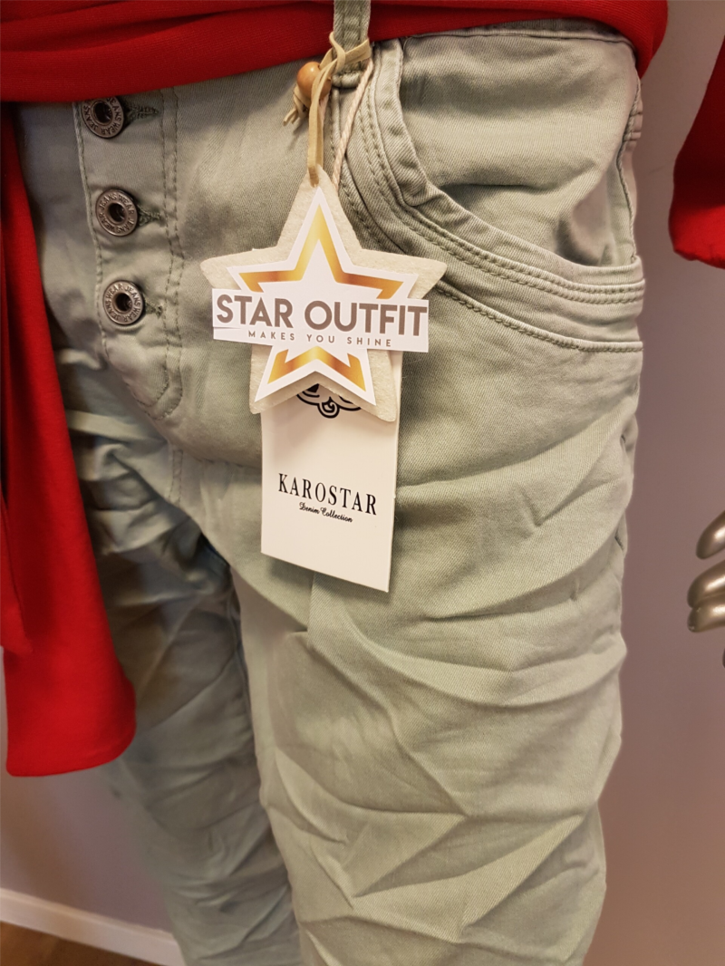★ Jeans van het merk Jewelly ('zusje' van Karostar) in heerlijk zittende stretchstof met rits in olijfgroen. Een musthave!