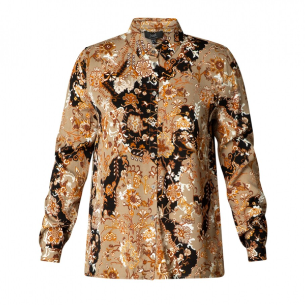 Een rechte printblouse van viscose met een kraag en een knoopsluiting voor. Deze blouse van Yest heeft lange mouwen met een manchet met sluiting. Afgerond aan de onderkant. Lengte ca. 69 cm. Materiaal:100% Viscose.