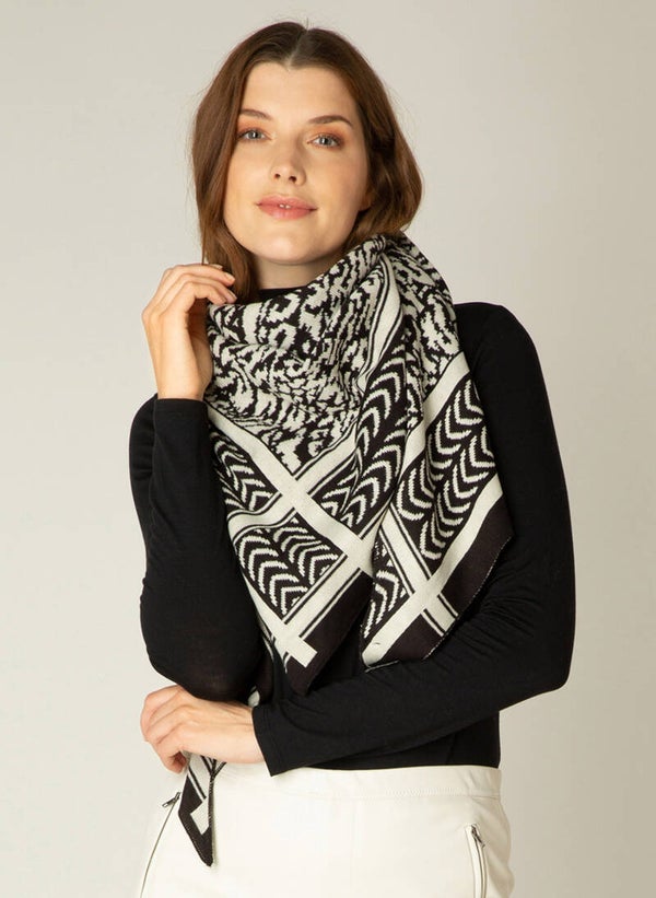Een heerlijke sjaal van in driehoekmodel, met een zwart witte print. De sjaal is lekker groot, en kun je ook als omslagdoek gebruiken 210 x135 cm. Materiaal: 100% PAN