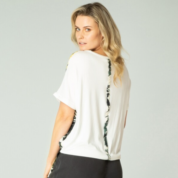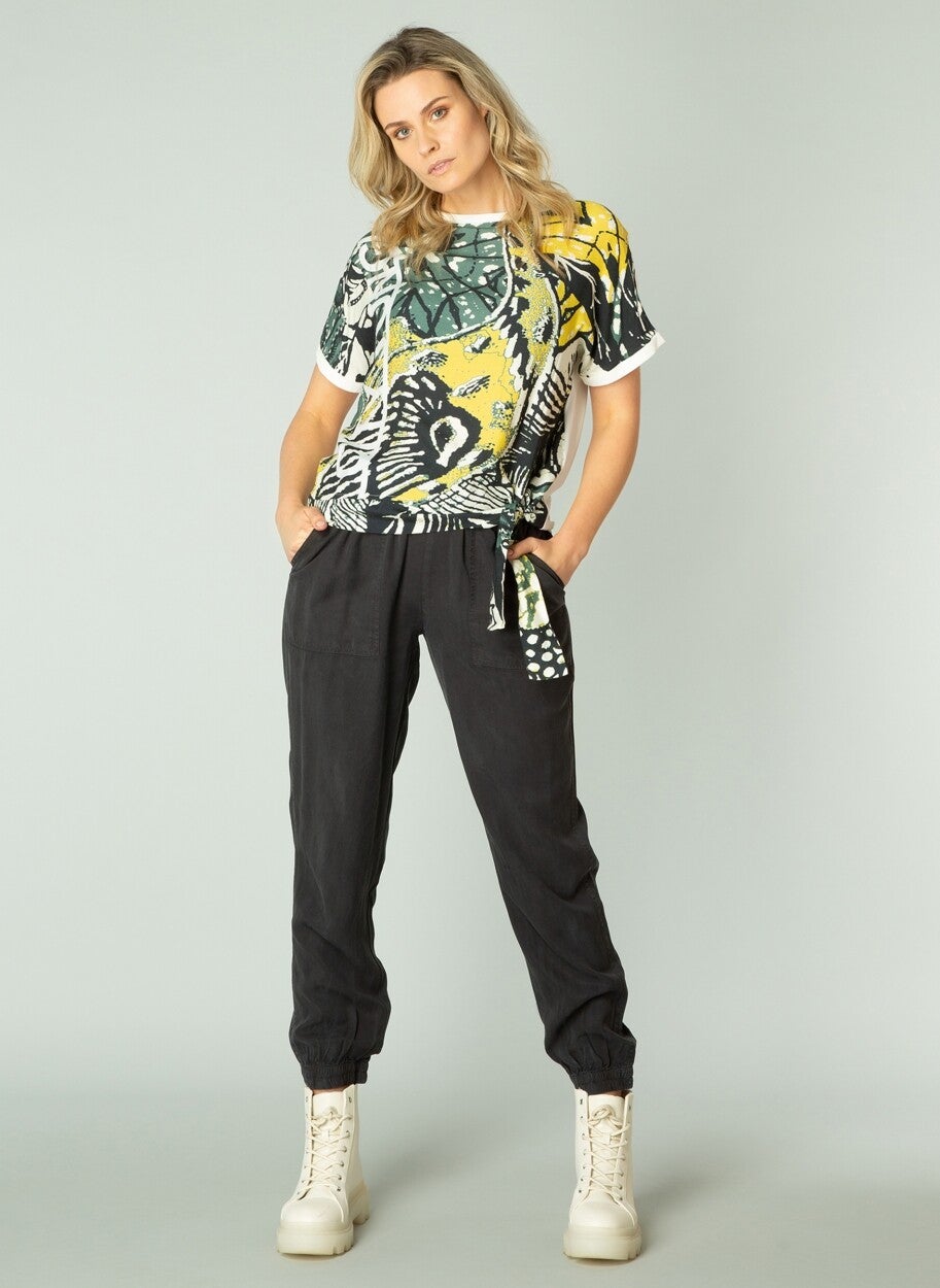 T-shirt van Yest Fashion met print aan de voorzijde en off white achterzijde met een verticale geprinte baan. Dit shirt van viscose heeft een hoge halslijn, korte mouwen en een strikje op de band. De Gryte van YEST heeft een Comfort Fit. Dit Jersey Shirt is verkrijgbaar in Dark Pine Green/Multi. Matriaal:94% Viscose, 6% Elastan. Lengte 64 cm