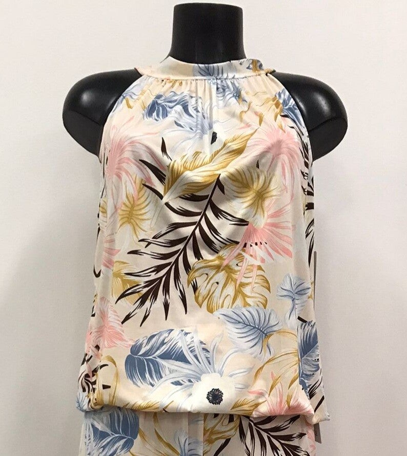 Haltertopje van Ella Style met bladeren print met lichtblauw, lichtroze, bruin op een zandkleurig basis. In een dunne travelstof van 95% polyester en 5% elasthan. One size, te dragen tot maat 44