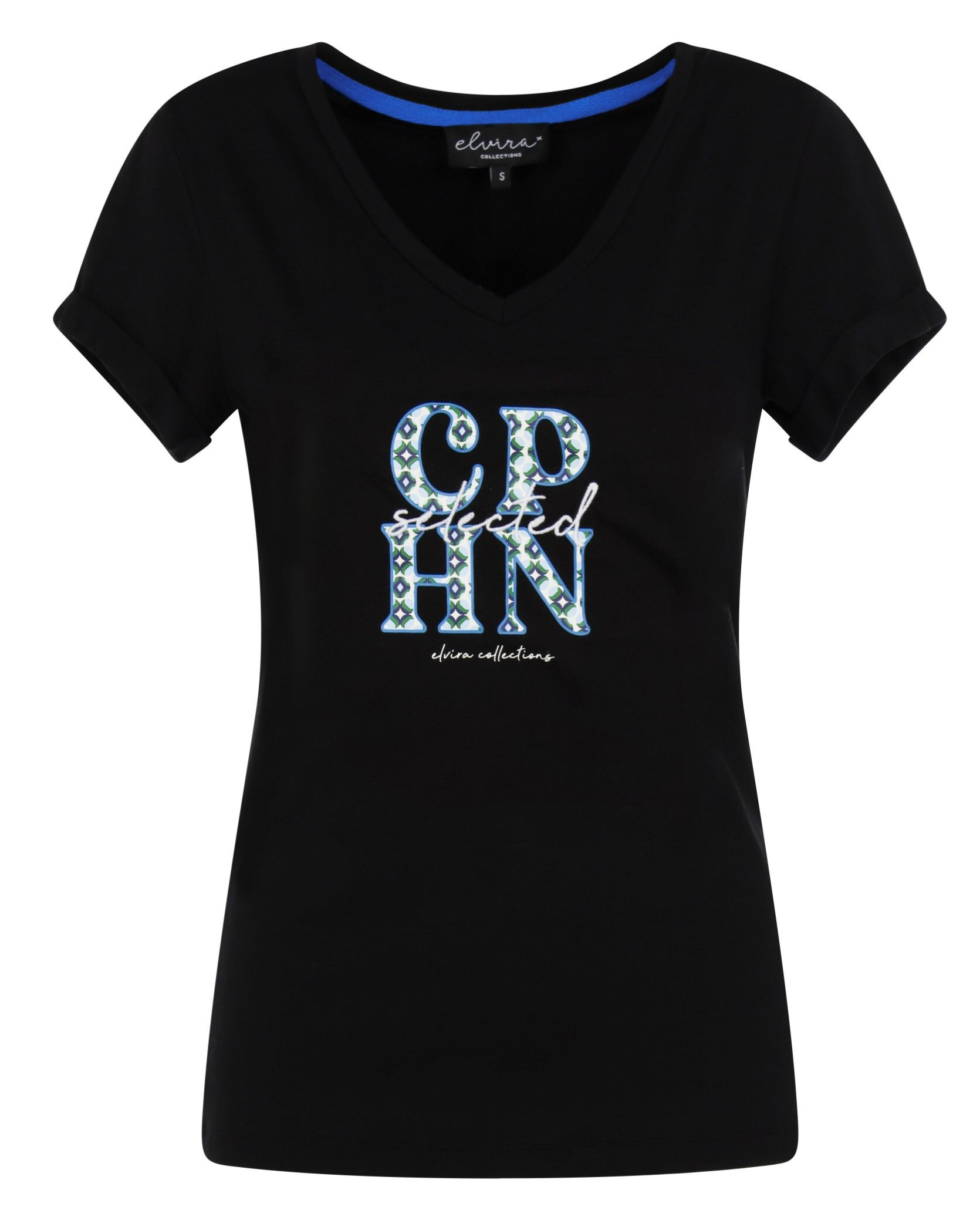 Elvira T-Shirt Mira. Dit t-shirt heeft een V-hals en een omgevouwen mouwtje. Het shirt heeft een tekstprint aan de voorzijde. Materiaal: 50% Katoen en 50% Modal.