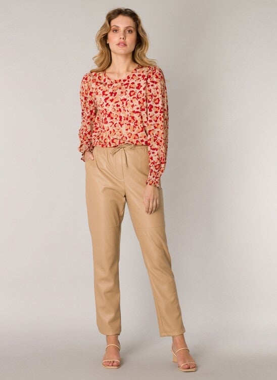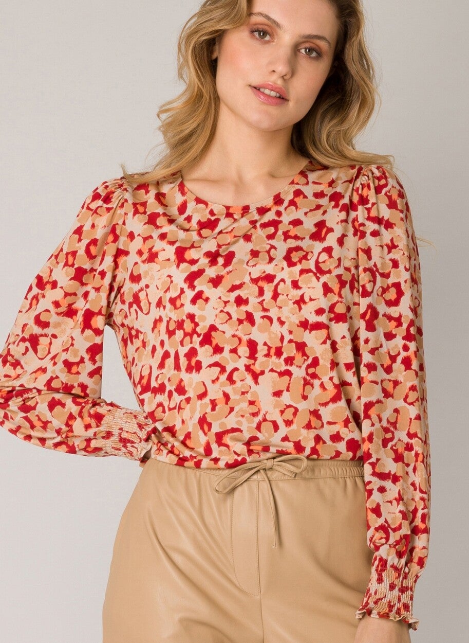 - Yest Fashion top in een rood-camel animalprint. Dit shirt van zachtglanzende kwaliteit jersey heeft plooien op de schouders en een gesmockte manchetboord. Lengte 62 cm