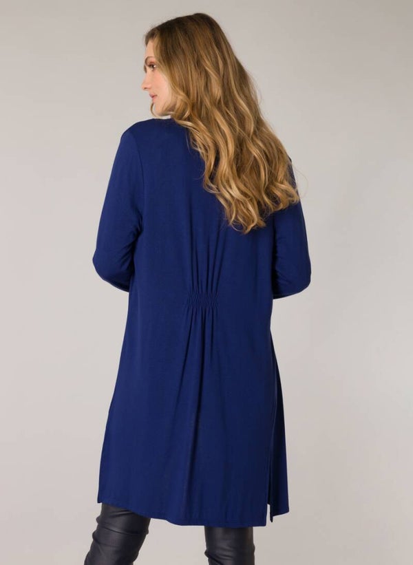 Halflang vest van Yest Fashion in een soepelvallende viscose jersey. In mooi Indigo blauw. Dit vest valt losjes open, heeft lange mouwen met een klein boordje en een kleine elastische taille inzet aan de achterkant. Lengte 90cm. Materiaal: 94% Viscose, 6% Elastan.